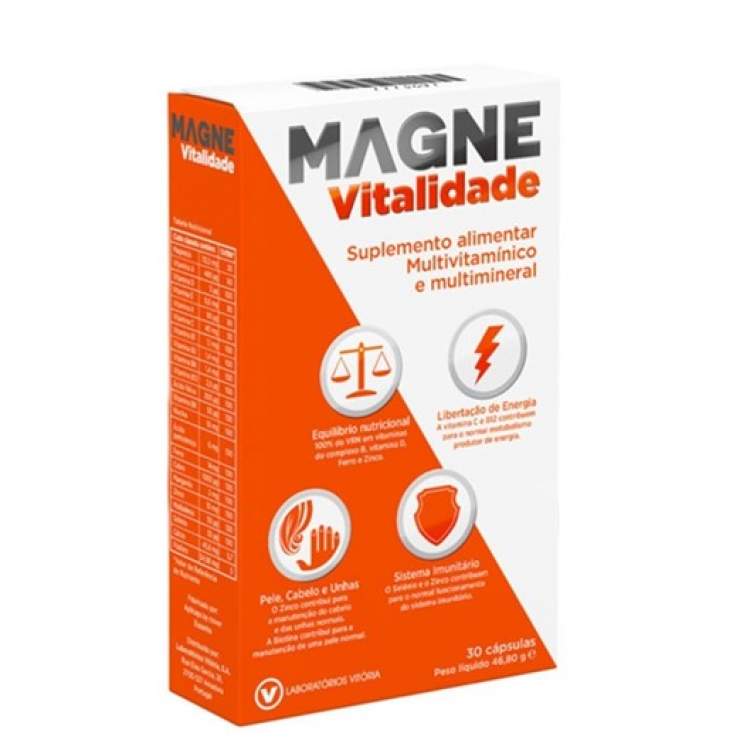 MAGNEVITALIDADE foi especialmente desenvolvido de forma a obter uma fórmula muito completa que inclui 13 vitaminas e 9 minerais. A sua fórmula contribui para o equilíbrio nutricional, melhorar a produção de energia, fortalecer pele, cabelo e unhas e para o normal funcionamento do sistema imunitário. Contém vitaminas do complexo B, B1, B2, B3, B5, B8, B9, vitamina A, C, D, E, K, magnésio, cálcio, fósforo e minerais, cobre, zinco, manganês, ferro, molibdénio e selénio. Apresenta, na sua maioria, 100% do valor de referência do nutriente. Posologia: 1 cápsula por dia.