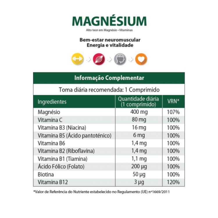 Suplemento alimentar para a redução do cansaço e fadiga, normal funcionamento muscular, melhora a produção de energia, auxilia o normal funcionamento do sistema nervoso e ajuda a manter uma normal função psicológica. Formulado com 616mg de Óxido de Magnésio, 70mg de Carbonato de Magnésio e 60mg de Bisglicinato de Magnésio o que se transmite numa absorção de cerca de 400mg de Magnésio. Fórmula complementada por Vitaminas como a Biotina, Vitamina B12 e Ácido Fólico. Tomar 1 comprimido por dia.