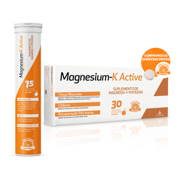Magnesium-K Active é um suplemento alimentar de Magnésio + Potássio, ideal para treinos de desgaste intenso. O esforço físico intenso pode provocar frequentemente cãibras, uma diminuição do desempenho e uma maior propensão para lesões musculares e das articulações. Magnesium-K Active é o novo suplemento alimentar que associa magnésio e potássio, desenvolvido a pensar em pessoas que praticam desporto de forma intensa e com maior desgaste e que por isso, estão sujeitos a uma forte sudação e maior necessidade de produção de energia. Magnesium-K Active é ainda adequado para quem pretende uma recuperação pós-treino mais rápida. Experimenta já um comprimido por dia e sente a diferença. Magnesium-K Active contribui para um normal funcionamento muscular, síntese normal das proteínas, equil+ibrio hidroeletrolítico, normal metabolismo energético, tensão arterial normal e normal funcionamento do sistema nervoso. A dose diária recomendada de Magnesium-K Active é 1 comprimido, após uma das refeições. Tal como todos os suplementos alimentares, Magnesium-K Active deve ser utilizado como complemento de um regime alimentar variado. A dose de 1 comprimido por dia não deve ser excedida.