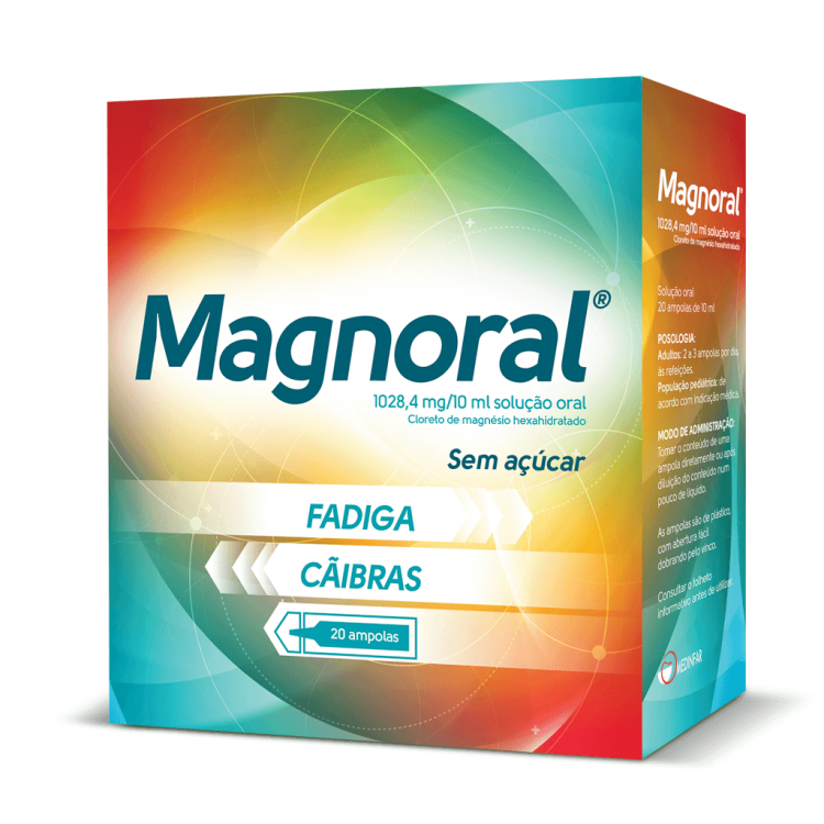 Magnoral® contém a substância ativa magnésio e pertence ao grupo dos medicamentos utilizados em nutrição (vitaminas e sais minerais). Está indicado na prevenção e alívio de queixas sugestivas de falta de magnésio, tais como fraqueza, fadiga, irritabilidade, náuseas, cãibras e formigueiro. Forma de apresentação: Ampolas bebíveis (solução oral) sem açúcar para prevenção e alívio de cãibras e fadiga. A dose recomendada para adultos: 2 a 3 ampolas por dia, às refeições. Uma dose diária de 3 ampolas de Magnoral corresponde a 98 % da dose diária recomendada de magnésio. Não tome magnoral se tem alguma alergia (hipersensibilidade) à substância ativa ou a qualquer outro componente do medicamento, se tem insuficiência renal grave com valores de depuração da creatinina inferiores a 30 ml/min; se tem hipermagnesemia (níveis de magnésio no sangue aumentados).