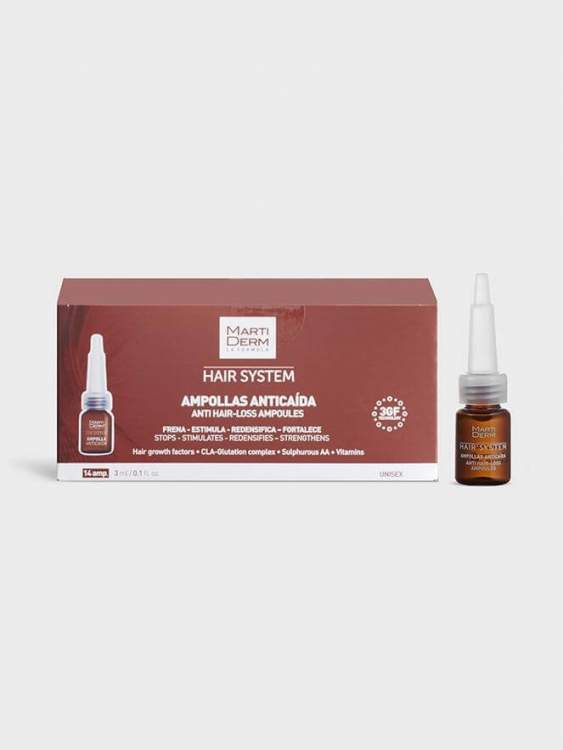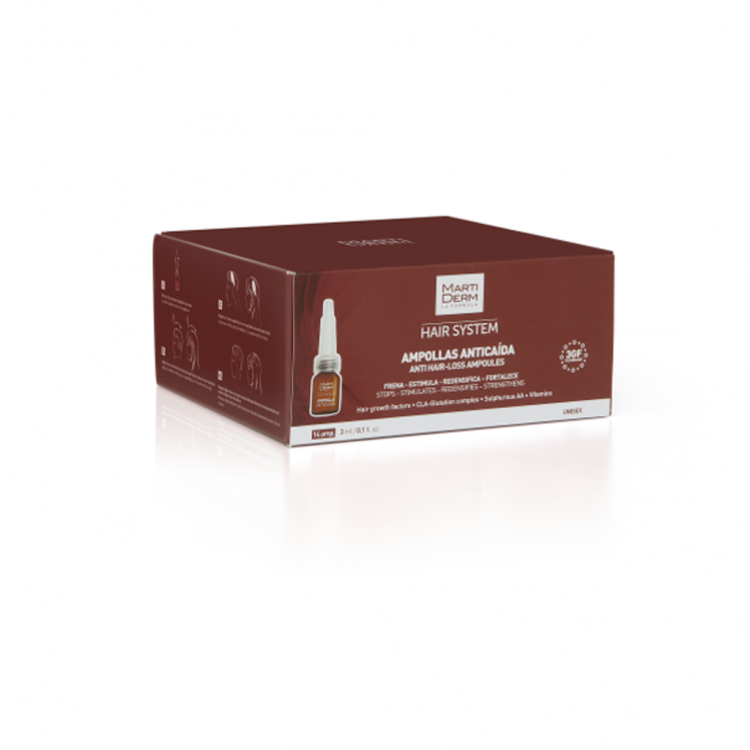 As Ampolas Antiqueda Hair System contêm fatores de crescimento capilar com que combatem os diferentes tipos de queda do cabelo (alopecia androgenética e eflúvio telógeno). Ajudam a travar o processo de queda e estimulam o crescimento de novos cabelos, aumentam a densidade e melhoram a fixação ao couro cabeludo, graças aos seus três fatores de crescimento, biotinil, ácido oleanólico, apigenina e um complexo vitamínico, entre outros ingredientes. O cabelo volta a recuperar a sua força e densidade. Aplicar diariamente: Oxigenar o couro cabeludo com uma escovagem de 2 minutos, aplicar o conteúdo de 1 ampola na zona afetada e massajar a zona até ser absorvido.