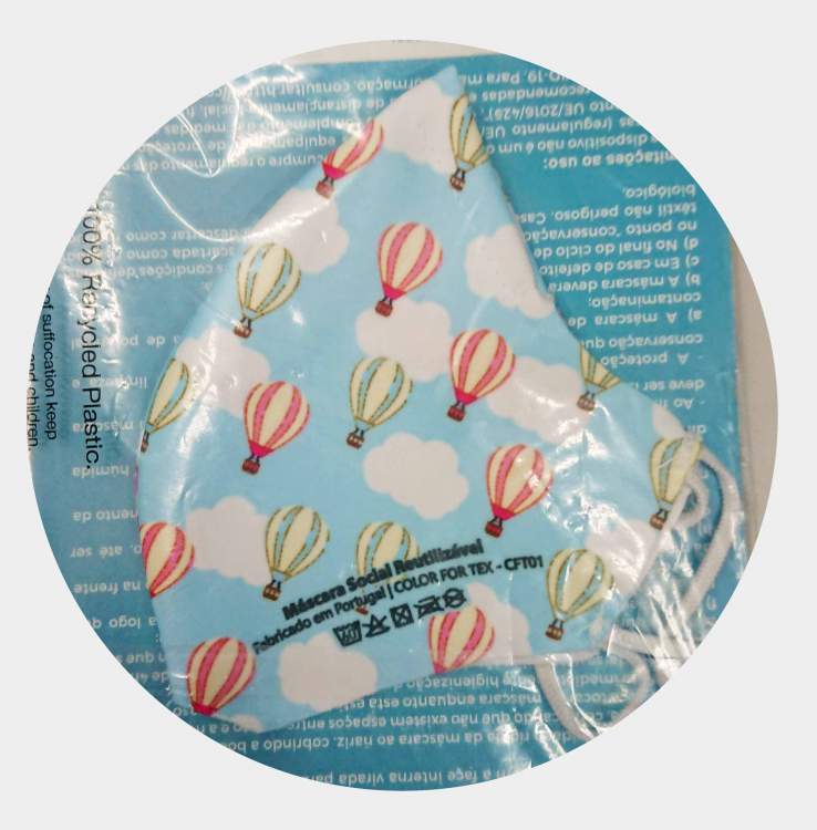 Embalagem com 1 máscara reutilizável. Padrão: Balões de ar quente.