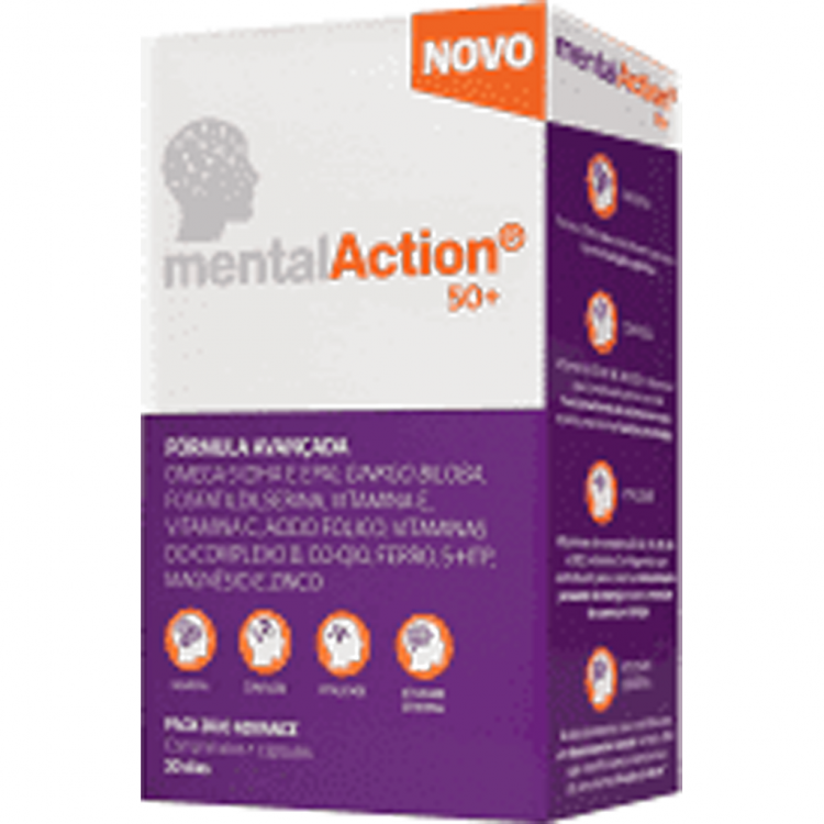 MentalAction 50+ é um estimulante cerebral desenvolvido especificamente para pessoas com mais de 50 anos que procuram manter uma vida ativa com manutenção das capacidades do cérebro e da memória. MEMÓRIA - O ferro e o zinco contribuem para a normal função cognitiva. CONFUSÃO - As Vitaminas B1, B3, B6, B8, B12 e C, contribuem para o normal funcionamento do sistema nervoso e função psicológica. VITALIDADE - As Vitaminas do complexo B, Vitamina C e Magnésio, contribuem para a função normal do metabolismo produtor de energia e para a redução do cansaço e fadiga. ATIVIDADE CEREBRAL - O Ácido pantoténico contribui para um desempenho mental normal e DHA para a manutenção da função cerebral.