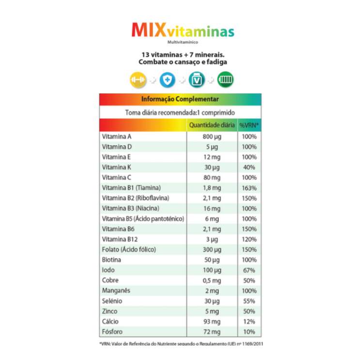 Suplemento alimentar multivitamínico com 100% da dose diária recomendada de várias vitaminas e ainda um alto teor em alguns minerais. Contribui para o bem-estar geral, a normal manutenção do sistema produtor de energia e funcionamento do sistema imunitário. Ajuda a evitar carências nutricionais, reforçar o organismo durante períodos de convalescença e combater o cansaço e a fadiga. Fórmula completa e reforçada com 13 Vitaminas e 7 Minerais. Tomar 1 comprimido por dia.