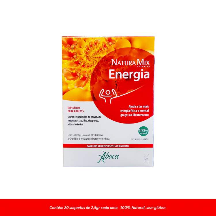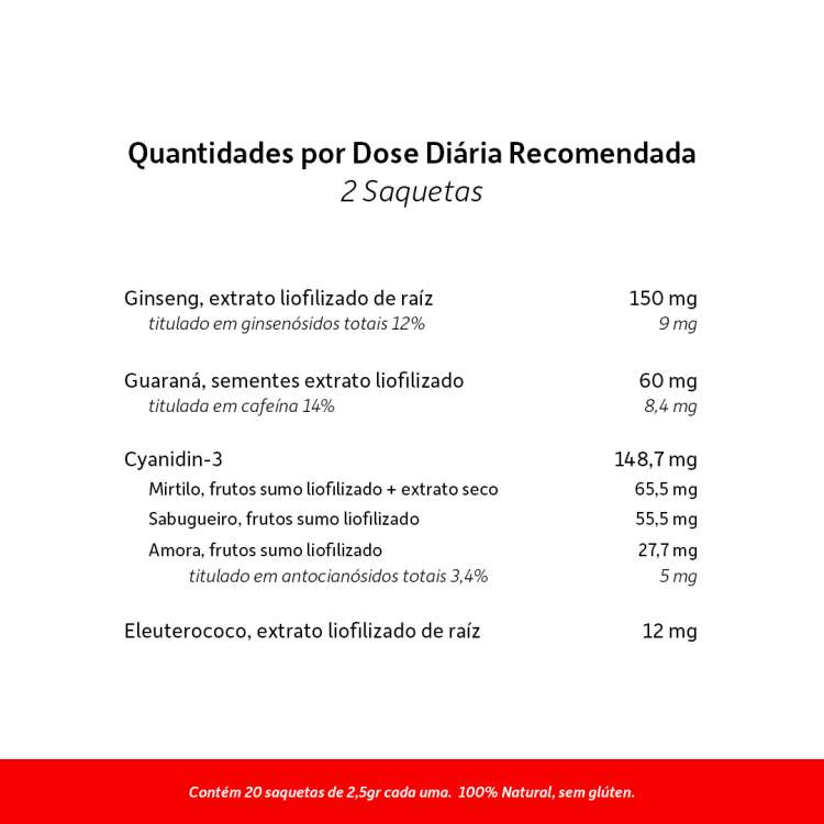 Suplemento alimentar, específico para adultos, indicado em períodos de atividade intensa (trabalho, desporto), vida dinâmica e para alturas de stress. Ajuda a combater o cansaço, e a aumentar a energia física e mental. Melhora ainda as defesas naturais do organismo. Fórmula enriquecida com ginseng, guaraná, frutos vermelhos e eleuterococo. Tomar 1 a 2 saquetas por dia, de manhã. Dissolver lentamente na boca ou diluir em sumo de fruta, água ou iogurte. Dissolver lentamente na boca ou diluir em sumo de fruta, água ou iogurte.