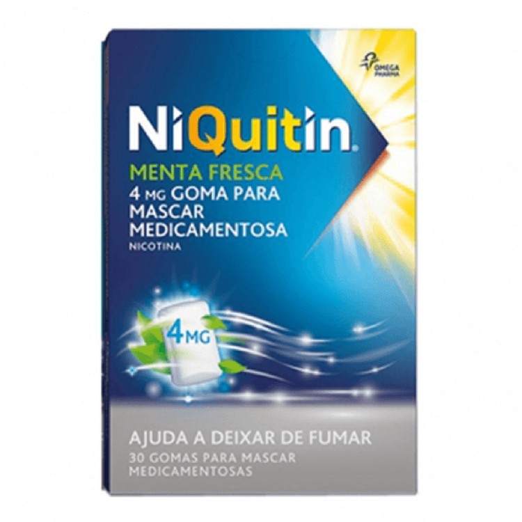 Medicamento não sujeito a receita médica, em forma de gomas para mascar, indicado no tratamento da dependência do tabaco com sabor a menta fresca. Ajuda a aliviar a vontade de fumar, a irritabilidade e mal-estar, para que possa gradualmente parar de fumar. A dosagem das gomas que irá utilizar depender do número de cigarros que fumava antes de iniciar a terapêutica NiQuitin e da fase do tratamento em que está. Cada goma para mascar contém 4mg de Nicotina.