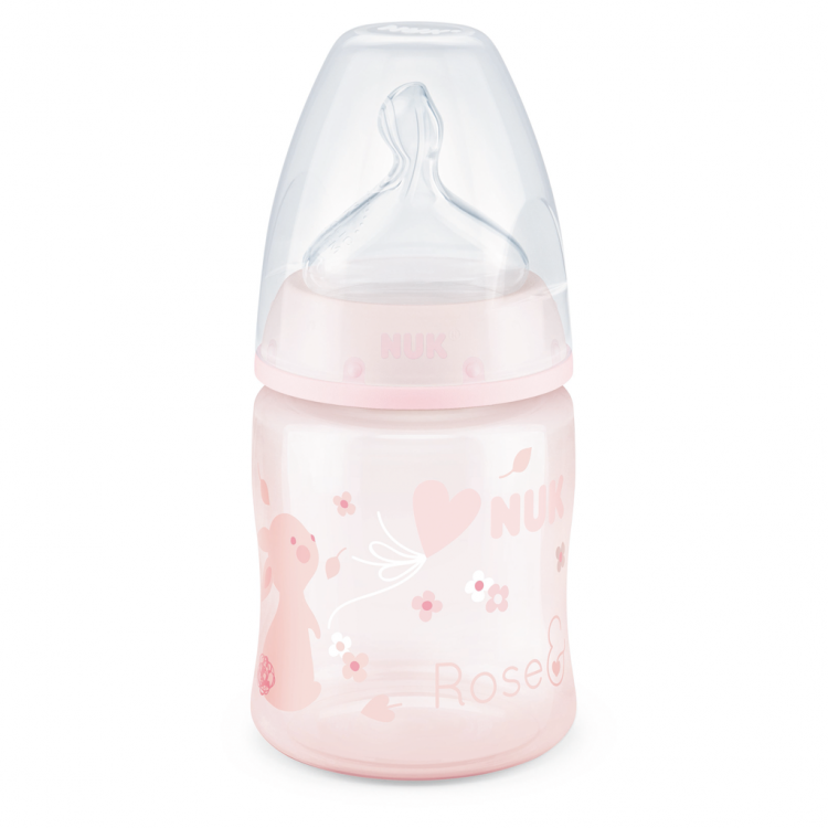 Biberão em poliamida com controlo de temperatura, tetina em silicone e sem BPA. Possui uma tetina flexível e adaptável à boca do bebé, com pequenos orifícios inspirados nos ductos mamários da mama da mãe e que garantem um fluxo de leite suave e natural. A tetina tem uma base de apoio mais larga e flexível permitindo ao bebé controlar o fluxo de leite. A inovadora válvula anti-cólicas torna possível ao bebé beber sem pausas, o que ajuda a prevenir a ingestão de ar. O biberão possui ainda um sistema para verificação da temperatura, se o leite estiver muito quente, o indicador (parece um termómetro) que normalmente está azul, mudará para branco. Idealmente, a comida para bebé deve estar à temperatura corporal (37 ° C = tom azul médio). O controlo de temperatura NUK é uma verificação adicional, verifique sempre a temperatura, colocando algumas gotas no interior do pulso, antes de dar o biberão.