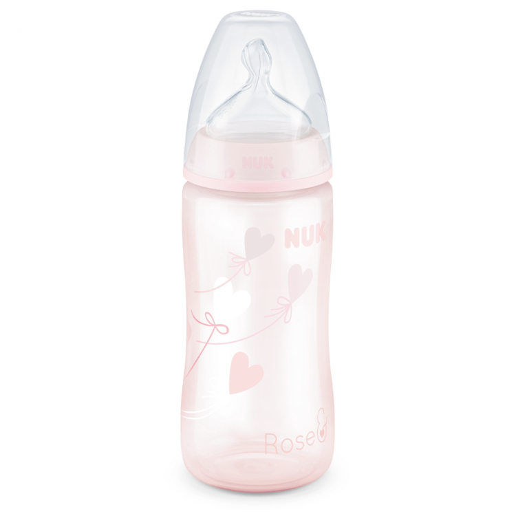 Biberão em poliamida com controlo de temperatura, tetina em silicone e sem BPA. Possui uma tetina flexível e adaptável à boca do bebé, com pequenos orifícios inspirados nos ductos mamários da mama da mãe e que garantem um fluxo de leite suave e natural. A tetina tem uma base de apoio mais larga e flexível permitindo ao bebé controlar o fluxo de leite. A inovadora válvula anti-cólicas torna possível ao bebé beber sem pausas, o que ajuda a prevenir a ingestão de ar. O biberão possui ainda um sistema para verificação da temperatura, se o leite estiver muito quente, o indicador (parece um termómetro) que normalmente está azul, mudará para branco. Idealmente, a comida para bebé deve estar à temperatura corporal (37 ° C = tom azul médio). O controlo de temperatura NUK é uma verificação adicional, verifique sempre a temperatura, colocando algumas gotas no interior do pulso, antes de dar o biberão.