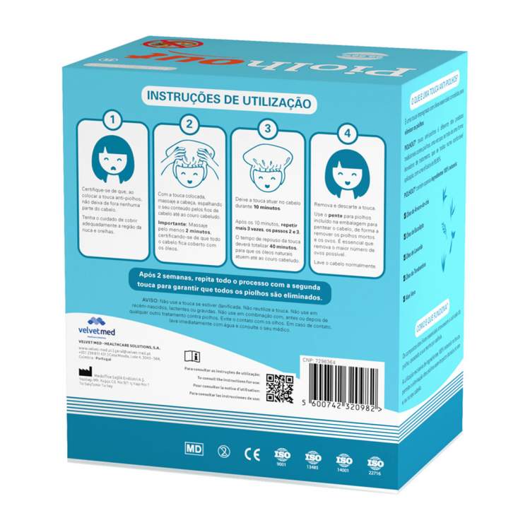 Dispositivo médico inovador no tratamento dos piolhos e lêndeas, que elimina os parasitas através de uma touca impregnada com óleos essenciais. Tratamento 100% natural, de aplicação fácil, prática e eficaz. Composição: Óleos essenciais de Árvore-do-chá, Eucalipto, Lavanda, Terebentina e Aloé vera.