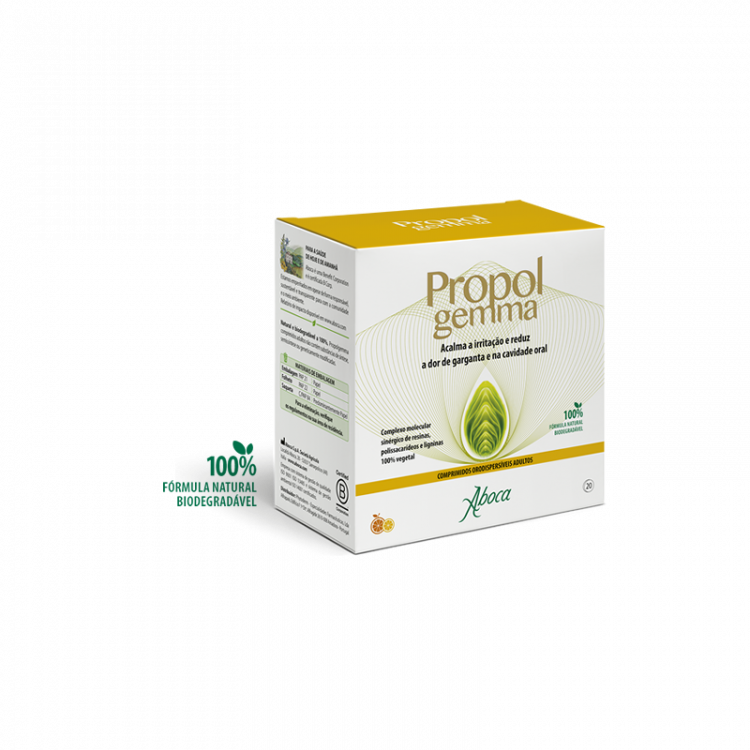 Propolgemma forma uma barreira protetora na mucosa inflamada e combate indiretamente a inflamação graças às propriedades antioxidantes dos flavonoides. Esta camada protetora e ativa acalma o ardor e reduz a hipersensibilidade, aliviando a sensação de desconforto e facilitando a deglutição. Propolgemma caracteriza-se pela presença dos componentes principais típicos da própolis juntamente com compostos funcionais do tecido vegetal dos rebentos de álamo. Propolgemma comprimidos adultos é indicado no tratamento da dor de garganta e doenças na cavidade oral (como estomatites, aftas e gengivites) associadas a ardor, dor e sensibilidade ao engolir. O produto também pode ser utilizado como proteção preventiva, em todos os casos em que há exposição a agentes externos agressivos ou irritantes (frio, fumo, smog). Recomenda-se dissolver lentamente na boca 1 comprimido, quando necessário, até um máximo de 6 comprimidos por dia.