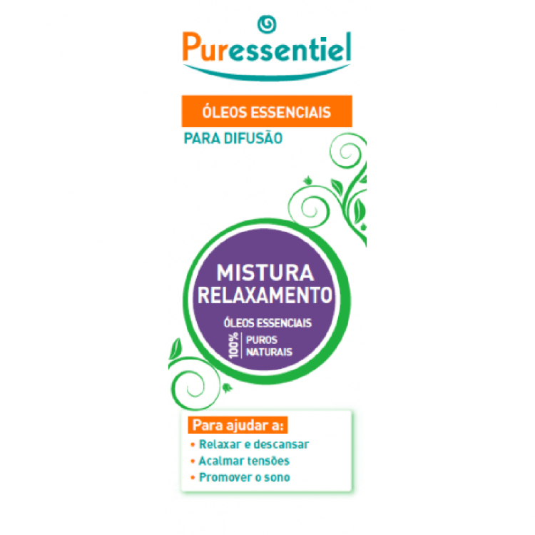Óleos essenciais 100% puros e naturais para difusão, para ajudar a relaxar, descansar, aliviar as tensões e promover o sono. Puressentiel Mistura Relaxamento é uma mistura composta por 10 óleos essenciais: Madeira Shiu, Cajeput, Camomila romana, Lavanda, Lavandim grosso, Manjerona, Laranja, Palmarosa, Laranjeira amarga (Petit grain), Sândalo amyris, Hortelã-Pimenta, Niauli, Óregãos, Pinheiro, Ravintsara, Alecrim e Salvia, com propriedades calmantes e relaxantes para ajudar a promover o descanso, o relaxamento e o sono naturalmente.