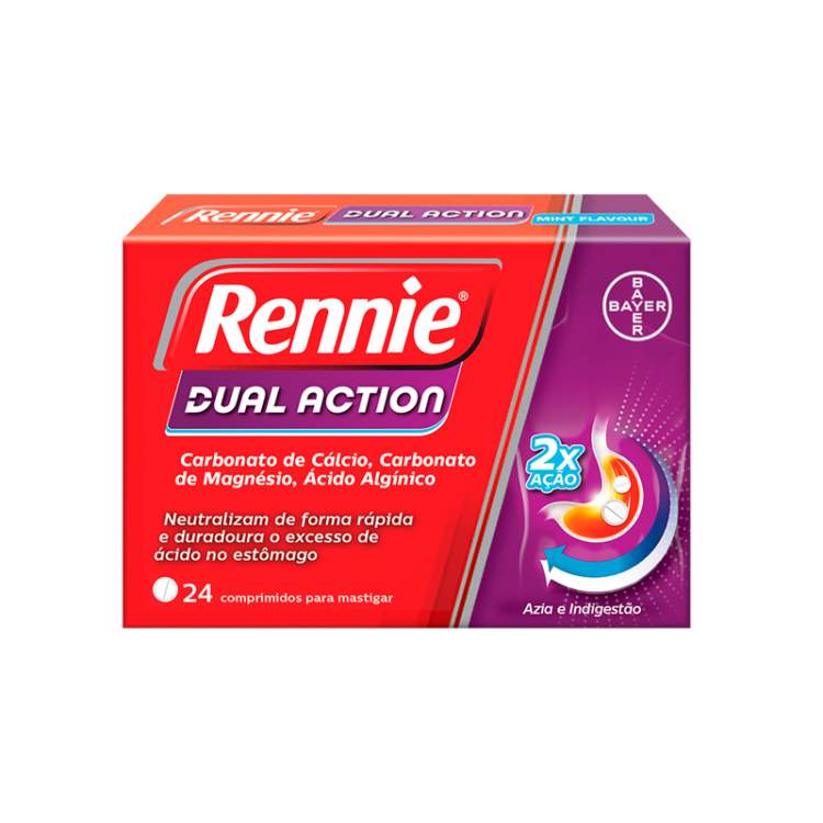 Rennie Dual Action alivia os sintomas de azia e indigestão ácida, neutralizando de forma rápida e duradoura o excesso de ácido no estômago. A sua dupla ação permite neutralizar o ácido do estômago e formar uma barreira protetora que irá impedir que o conteúdo ácido escape para cima, aliviando o ardor ou a dor no peito em apenas 2 minutos. Indicado em caso de azia, indigestão, refluxo e azia na gravidez. Tome 2 comprimidos para mastigar de preferência 1 hora após as refeições e antes de ir para a cama. Em caso de azia pode tomar 2 comprimidos entre refeições. Não exceder os 12 comprimidos por dia e não tomar continuamente durante mais de 2 semanas. Composição: 625mg de Carbonato de Cálcio, 73,5mg de Carbonato de magnésio e 150mg de Ácido algínico. Pode ser tomado durante a gravidez e a amamentação, sem risco para o feto ou para a criança.