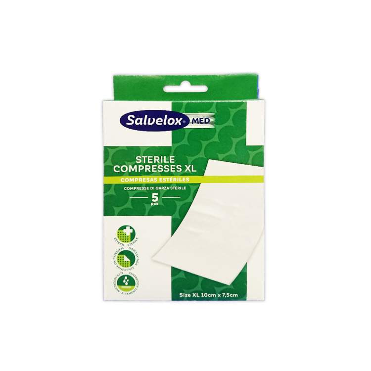 Embalagem com 5 compressas estéreis. Tamanho: 10cm x 7,5cm.