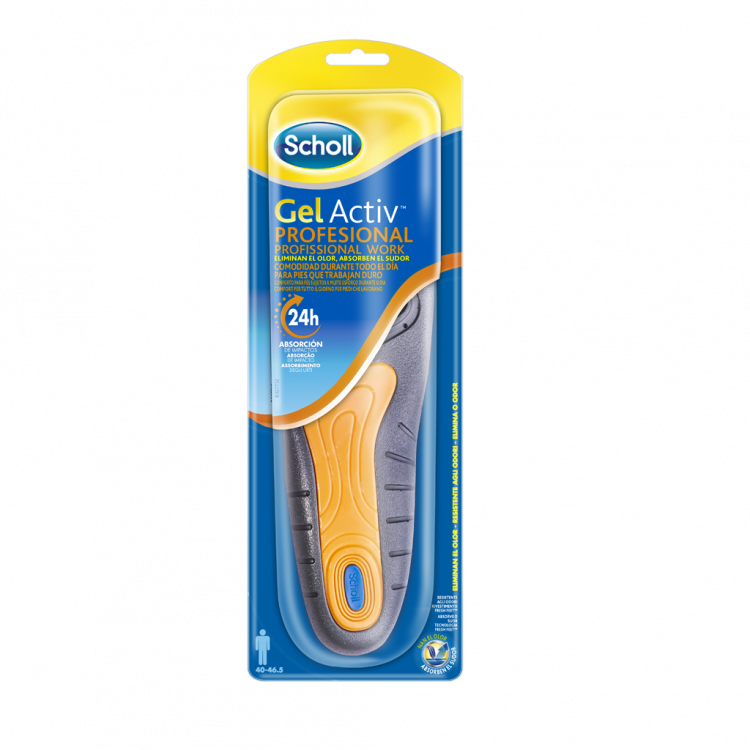 As palmilhas Scholl GelActiv™proporcionam uma absorção dos impactos e uma proteção superior quando comparada com uma não utilização. A forma das palmilhas ajuda a reduzir a pressão excessiva a que submetemos os nossos pés através da tecnologia GelActiv™. Palmilhas Profissional Para um apoio ao longo de todo o dia. A tecnologia GelActiv suaviza o impacto quando os seus pés entram em contacto com o chão e oferece suporte ao longo de todo o dia – especialmente útil se o seu trabalho implica que fique muitas horas de pé. Assim, o seu dia de trabalho poderá durar o tempo que precisar. Tecido transpirável que ajuda a manter os pés secos.