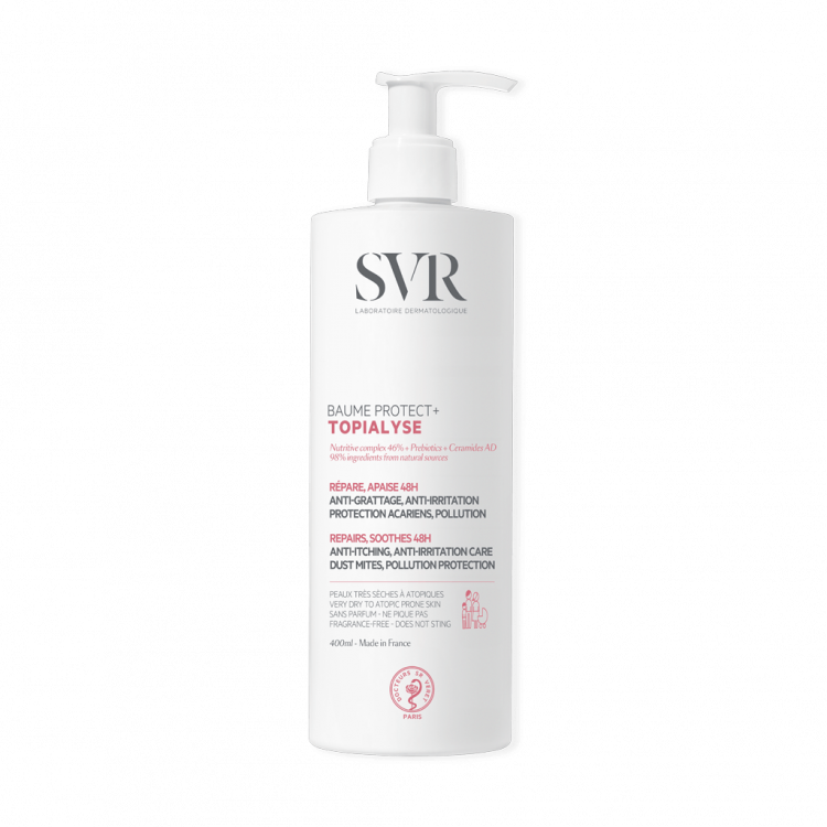 TOPIALYSE BAUME PROTECT+ é o primeiro produto de cuidado da pele enriquecido com a nossa patente de Ceramidas AD1 que protege contra agressores ambientais (ácaros, poluição, etc.) que podem agravar a irritação e a comichão. Este bálsamo alivia imediata e duradouramente as sensações de prurido, resultando numa pele que se mantém suave, protegida e reparada. A sua textura nutritiva e lipídica funde-se na pele, deixando uma película protetora que impede a adesão de partículas de poluição. Graças à sua fórmula não oleosa e não pegajosa, pode vestir-se logo a seguir à sua aplicação! TOPIALYSE BAUME PROTECT+ é feito a partir de apenas 20 ingredientes que são 98% de origem natural. Sem fragrâncias, mas com um aroma delicado.