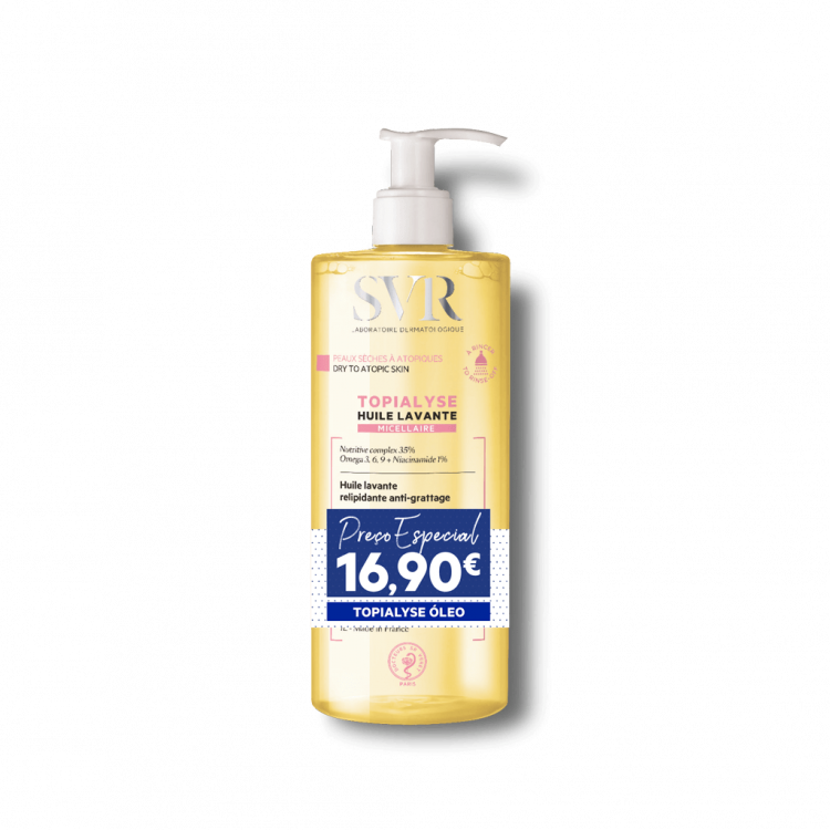 Óleo lavante anti-irritação e antiprurido, rico em princípios ativos lipídicos e hidratantes, nutre intensamente a pele. Preserva a película hidrolipídica e hidratação durante 24 horas, protege contra as agressões externas (frio, fricção) e dos efeitos de secura da água calcária. Fórmula sem sabão com tensioactivos suaves, que não arde nos olhos. Possui 35% de ingredientes activos reconstituintes dos lípidos.