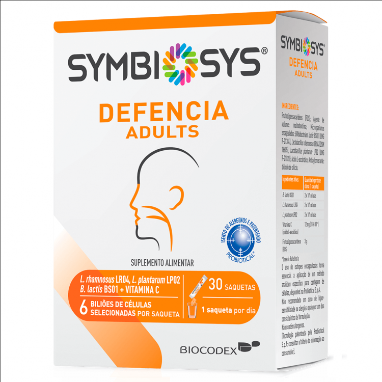 Symbiosys Defencia Adults é um suplemento alimentar, desenhado para ajudar as defesas imunitárias. Contém as estirpes de bactérias, Bifidobacterium lactis BS01, Lactobacillus rhamnosus LR04 e Lactobacillus plantarum LP02, e ainda Vitamina C que contribui para o normal funcionamento do sistema imunitário, especialmente durante os meses de inverno.