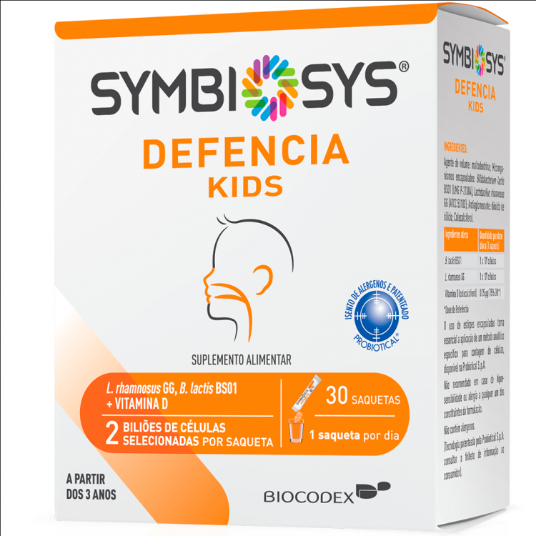 SYMBIOSYS Defencia kids é um suplemento alimentar para crianças a partir dos 3 anos, que foi desenvolvido para complementar uma dieta alimentar variada e equilibrada. Contém as estirpes bacterianas específicas Bifidobacterium lactis BS01 e Lactobacillus rhamnosus GG, além de Vitamina D3 que contribui para o normal funcionamento do sistema imunitário das crianças, especialmente durante os meses de inverno. As estirpes bacterianas foram cuidadosamente selecionadas para aproveitar o potencial inexplorado da microbiota intestinal das crianças.