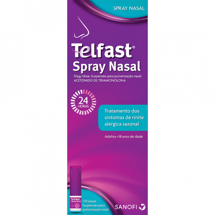 Telfast Spray Nasal indicado no tratamento dos sintomas nasais da rinite alérgica, tais como espirros, comichão, nariz entupido, congestão e corrimento nasal. A sua fórmula tem como base o acetonido de triamcinolona (corticosteroide) e possui um tempo médio de ação. Tem de ser usado regularmente para se conseguir o alívio dos sintomas, em algumas pessoas pode demorar até 3 a 4 dias até se notar o efeito.