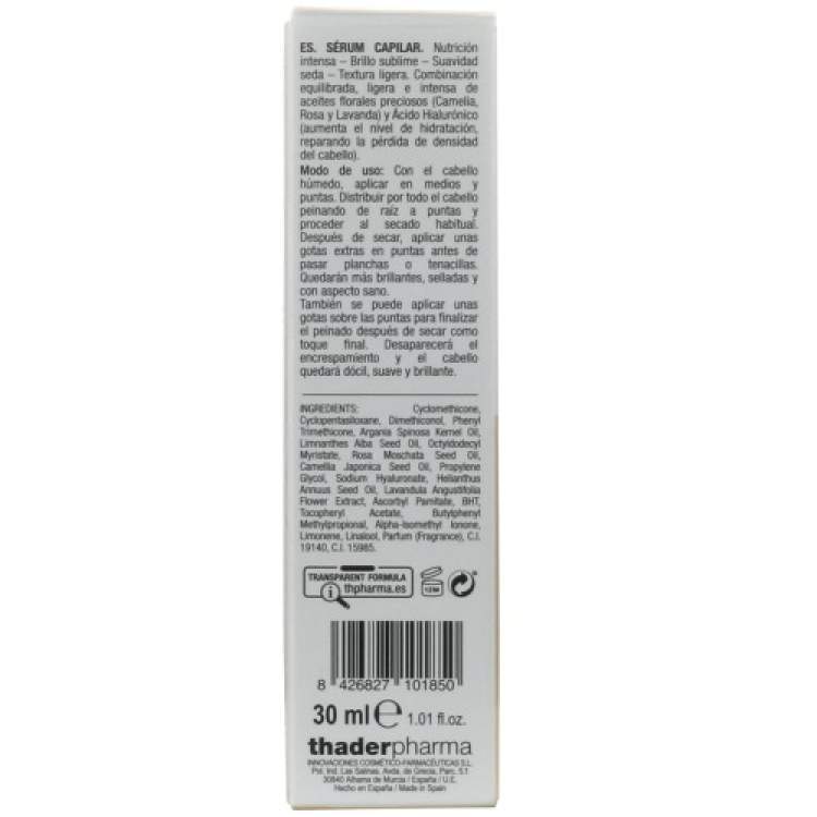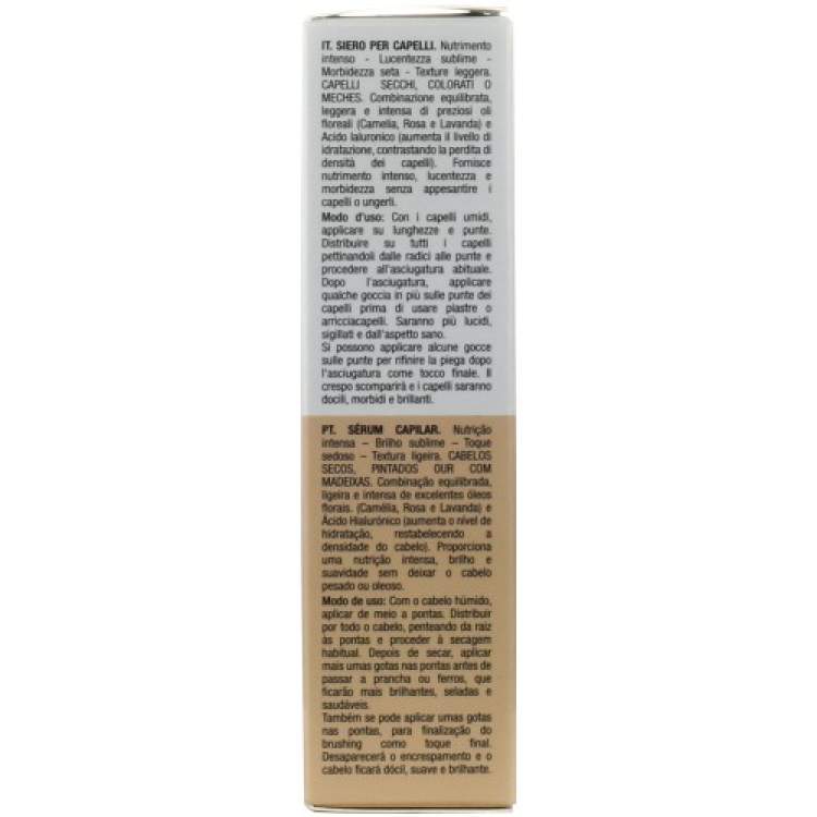 Sérum capilar para uma nutrição intensa, brilho e suavidade sem pesar. Combina na sua fórmula óleos florais (Camélia, Rosa, Lavanda) e Ácido Hialurónico que permitem nutrir e manter a hidratação dos fios, para que este mantenha o seu aspeto brilhante e saudável. A sua textura é leve, para que não pese nos fios. Indicado para cabelos secos, pintados ou com madeixas. Pode ser aplicado no cabelo húmido, do meio do comprimento até às pontas, ou após secar, nas pontas, para as selar e manter saudáveis.