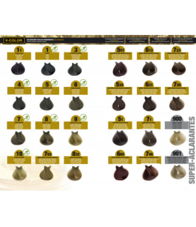 Kit de Coloração com: 1 tubo de coloração capilar permanente V-COLOR, sem amoníaco, 1 garrafa de Emulsão Reveladora com aplicador, 1 par de luvas de alta qualidade, 1 saqueta de V Gold Shampoo e 1 saqueta de V Gold Mask.