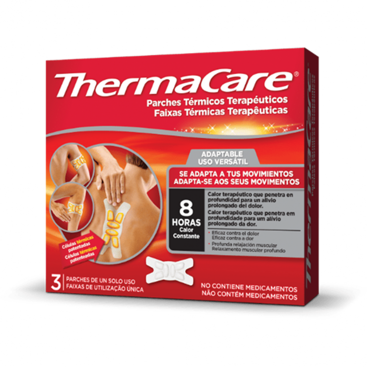 Faixas com efeito quente e não medicamentosa, indicadas para o tratamento da dor muscular e articular localizada. As suas 6 células térmicas dilatam os vasos sanguíneos e estimulam a circulação, potenciando o aporte de oxigénio e nutrientes aos tecidos lesados e facilitando a sua recuperação. O calor contribui para o relaxamento dos músculos contraídos e dolorosos, melhorando a flexibilidade e reduzindo a rigidez, contribuindo para o alívio imediato da dor e maior rapidez do processo de recuperação. As faixas Thermacare Versátil permitem uma aplicação mais flexível e adaptável a diversas partes do corpo. O efeito de calor terapêutico dura até 8h.