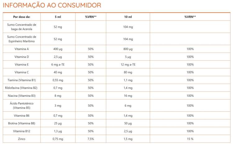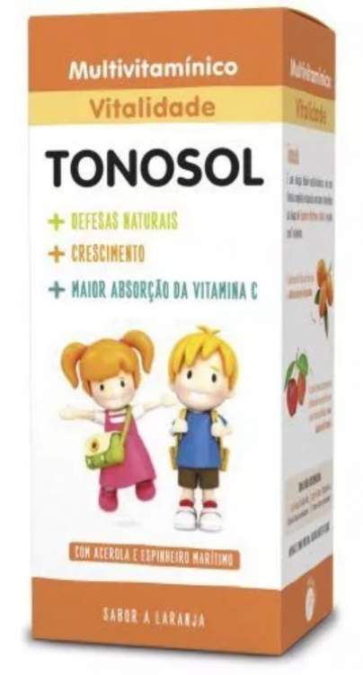 Tonosol Vitalidade é um multivitamínico que possui uma fórmula completa com 100% dos Valores de Referência do Nutriente de diversas vitaminas e agradável sabor a laranja. Contém: - Vitamina A > Contribui para o normal funcionamento do sistema imunitário. - Vitamina B2 > (Riboflavina) contribui para o normal metabolismo produtor de energia. - Vitamina B8 > (Biotina) contribui para o normal funcionamento do sistema nervoso e para uma normal função psicológica. - Vitamina B12 > Contribui para o normal funcionamento do sistema nervoso e para a redução do cansaço e da fadiga. - Zinco > Contribui para uma normal função cognitiva e para a manutenção de uma visão normal. - Vitamina D > Contribui para a normal absorção/utilização do cálcio e do fósforo, para a manutenção de ossos normais e do normal funcionamento muscular. - Vitamina D > É necessária para o crescimento e desenvolvimento normais dos ossos das crianças. COMPOSIÇÃO: 3 a 6 anos - 5ml por dia; Crianças com mais de 6 anos, adolescentes e adultos - 10ml por dia. Agitar antes de usar.
