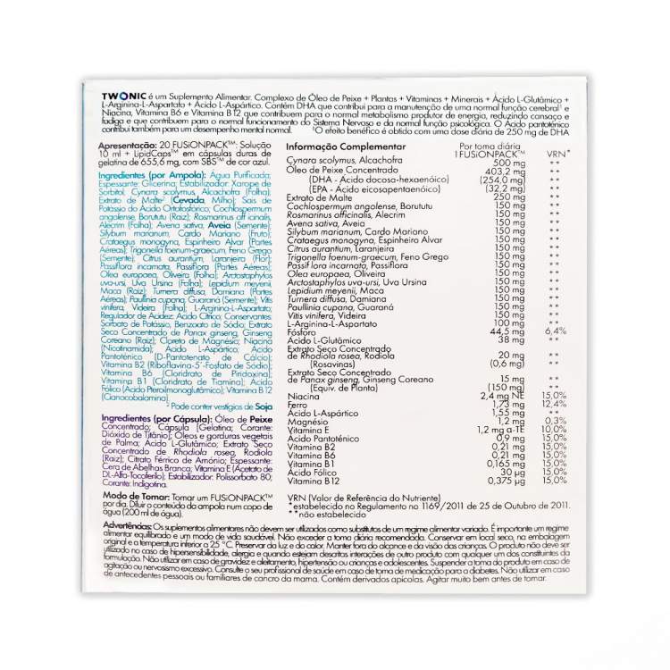 Suplemento alimentar que contribui para a manutenção de uma normal função cerebral e metabolismo produtor de energia. Ajuda a reduzir o cansaço e a fadiga e contribui para o normal funcionamento do sistema nervoso e da função psicológica. Contém na sua formulação Complexo de Óleo de Peixe, Plantas, Vitaminas, Minerais, Ácido L-Glutâmico, Niacina e Ácido Pantoténico.
