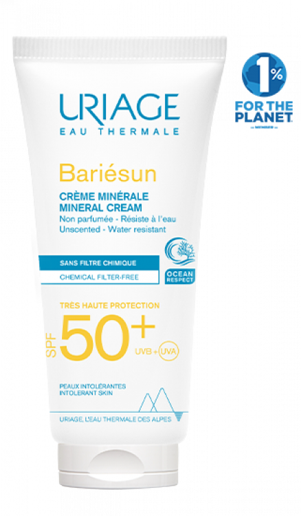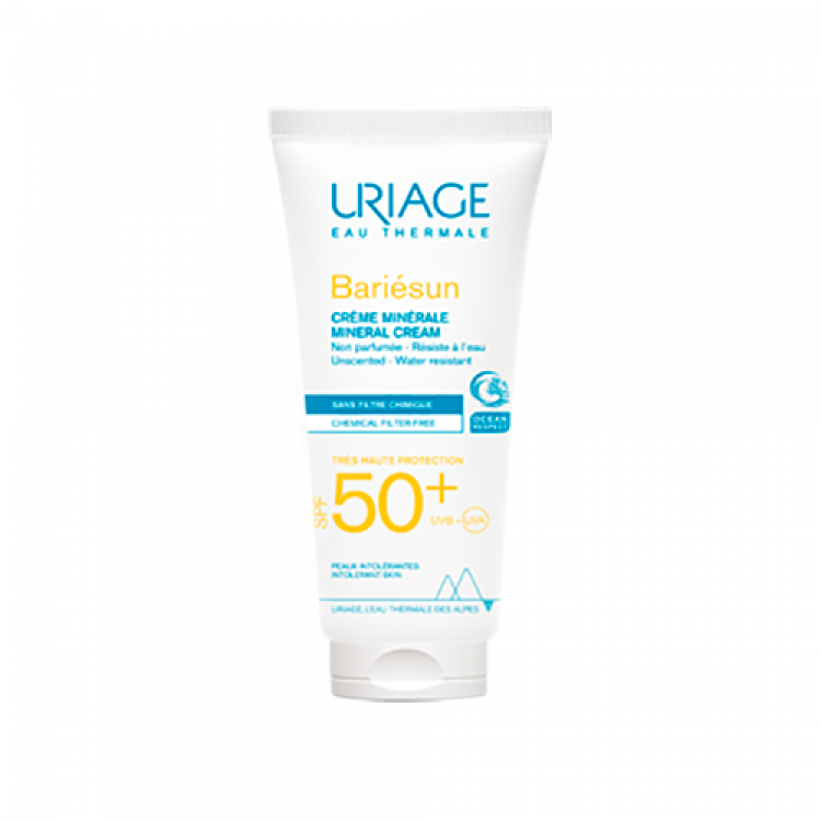 Protetor solar mineral com proteção muito elevada, UVA e UVB, para pele sensível ou intolerante a filtros químicos, perfume e conservantes. Possui uma textura não oleosa suave, de acabamento invisível. Fórmula hidratante com Aquaspongines, Água Termal de Uriage, Complexo UVA-UVB 100% mineral e Vitamina C e E, que protege contra a desidratação. Testado sob controlo dermatológico.