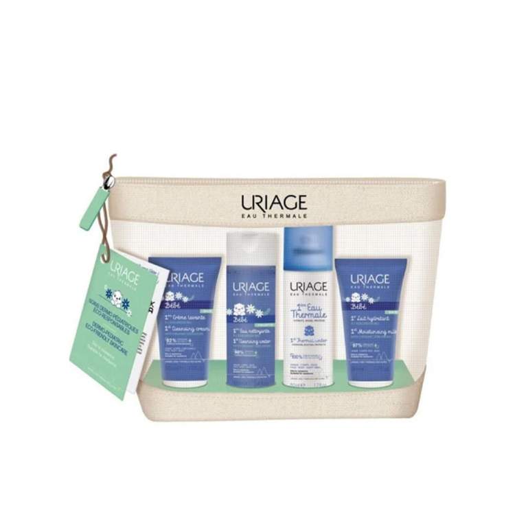 Kit de Viagem Uriage Bebé: 1x Creme Lavante de 50ml + 1x Leite Hidratante de 50ml + 1x Água de Limpeza de 100ml + Água Termal de 50ml.