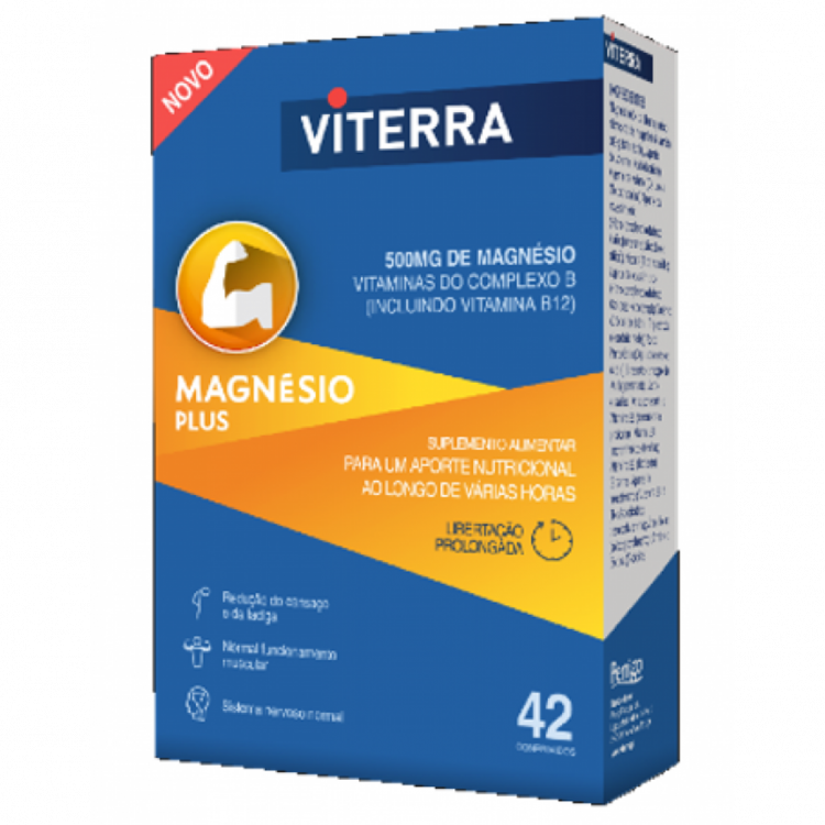 Viterra Magnésio Plus apresenta uma elevada concentração de magnésio e vitaminas do complexo B, de libertação prolongada, para a redução do cansaço e fadiga, normal funcionamento muscular e do sistema nervoso. Tecnologia de libertação prolongada que liberta os seus nutrientes de forma sustentada ao longo de várias horas, garantindo um aporte nutricional contínuo para o seu corpo. Cada comprimido contém 500mg de magnésio em combinação com vitaminas do complexo B, entre as quais B2, B6 e B12. Sem glúten. Sem gelatina. Sem lactose. Apropriado para vegetarianos.