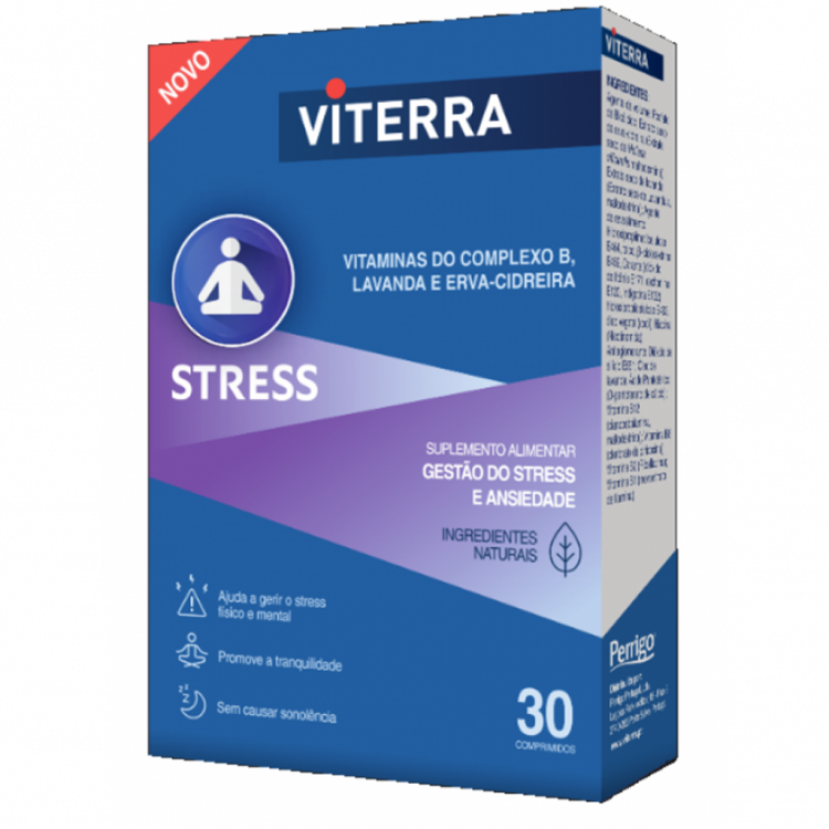 Viterra Stress, à base de ingredientes naturais como a lavanda e a erva-cidreira, ajuda a gerir o stress e ansiedade, promovendo uma sensação de relaxamento, bem-estar e tranquilidade. Ajuda a manter os níveis normais de energia e contribui para um normal funcionamento do sistema nervoso, sem causar sonolência. Tem na sua constituação: Vitaminas B1, B6 e B12 para uma normal função psicológica e normal metabolismo produtor de energia Vitamina B2, ácido pantoténico e vitamina B12 que contribuem para a redução do cansaço e fadiga. Ácido fólico, Magnésio e Vitamina B12 que contribuem para a redução do cansaço e fadiga e Vitaminas B1, B6 e B12 para uma normal função psicológica e normal funcionamento do sistema nervoso. Ácido pantoténico contribui para um desempenho mental normal.