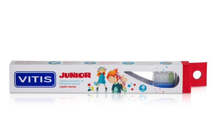 VITIS junior escova de dentes é uma escova de uso diário especialmente indicada para a higiene bucal em crianças a partir dos 6 anos. A escova VITIS junior possui uma cabeça de tamanho pequeno que lhe permite chegar a todas as zonas da boca das crianças. Os seus filamentos são suaves, de Tynex, com extremidades arredondadas e texturizadas que eliminam a placa bacteriana (biofilme dental) eficazmente, sem danificar o esmalte dentário nem as gengivas. Apresenta a zona de ataque monotip, para eliminar a placa bacteriana mais resistente. O seu pescoço estreito permite alcançar toda a cavidade bucal sem dificuldade e esforço por parte da criança. O cabo ergonómico com estrias antideslizantes da escova VITIS júnior, adapta-se perfeitamente à mão das crianças com esta idade. Tem também, um orifício através do qual pode passar um cordão para, no caso de querer colocar a identificação com o nome da criança. A escova de dentes VITIS júnior incorpora uma capa protetora da cabeça da escova que mantem os filamentos agrupados e em condições ótimas de higiene, permitindo uma rápida secagem. VITIS® júnior escova de dentes está indicada para a higiene oral em crianças com mais de 6 anos.