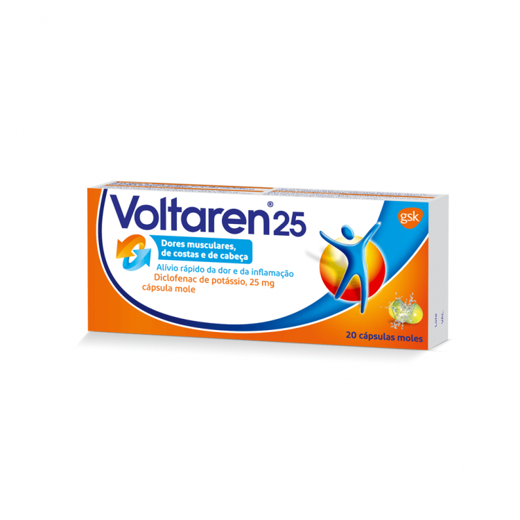 Cápsulas moles de rápida atuação com 25mg de Diclofenac de Potássio. Começa a atuar em 15 minutos após a toma, graças ao seu potente anti-inflamatório diclofenac, que não só proporciona um alívio da dor, como trata uma das suas principais fontes, a inflamação. Indicado em situações de dores de cabeça, dores de dentes, dores menstruais, dores musculares e reumáticas, dores nas costas ou febre. As cápsulas moles de Voltaren devem ser engolidas inteiras com um copo cheio de água, durante ou após a refeição. As cápsulas moles de Voltaren destinam-se a ser utilizados durante um curto período, até 5 dias para aliviar a dor ou 3 dias em situações de febre. Posologia: Adultos e crianças com idade igual ou superior a 14 anos tomam inicialmente uma cápsula mole no início dos sintomas. Se necessário, pode ser tomada uma cápsula mole a cada 4 a 6 horas, se necessário. Não devem ser tomadas mais de 3 cápsulas moles (75mg) no período de 24 horas.