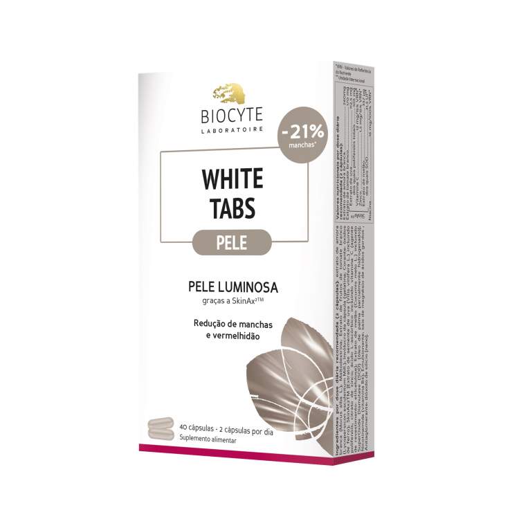 Suplemento alimentar que melhora a tez da pele e reduz as manchas e vermelhidão. Fórmula exclusiva com SkinAx2® (Extrato de Graínhas de Uva, Vitamina C, Zinco, Extrato de Melão), Tomate Branco e Amora Branca, rica em polifenóis. Ajuda ainda a revitalizar a pele e melhorar a sua saúde e aspeto geral. Recomenda-se a toma de 2 cápsulas por dia durante um mínimo de 3 meses.