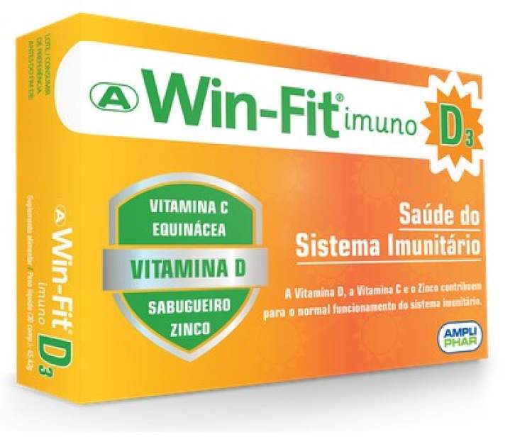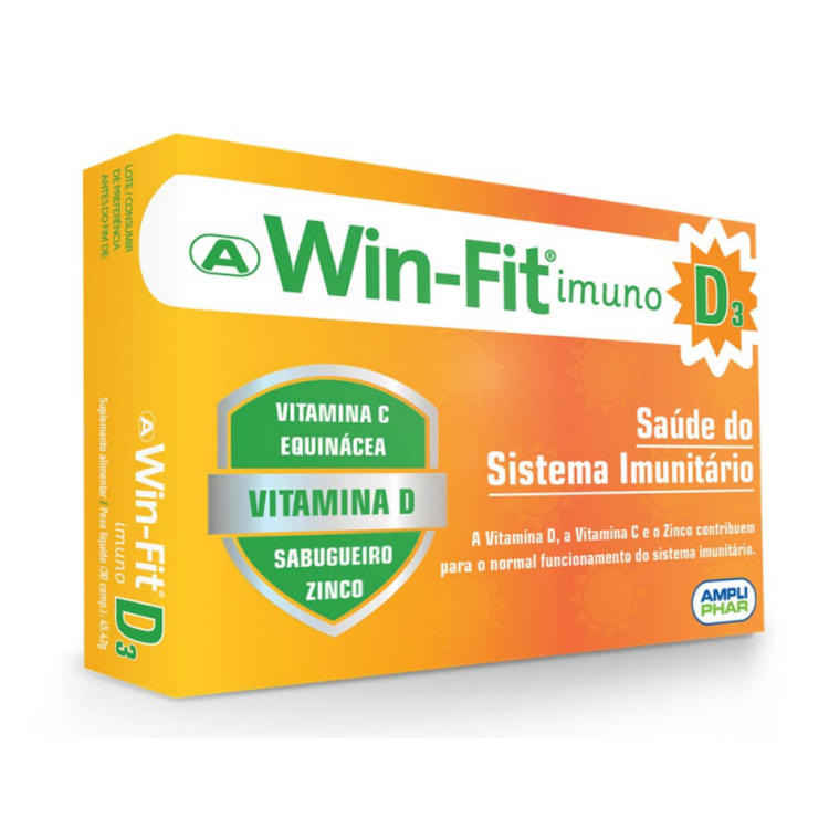 Win-Fit Imuno D3 é um suplemento alimentar que reforça o sistema imunitário e é composto por vitamina D, C, equinácea, sabugueiro e zinco. Estes nutrientes contribuem para o normal funcionamento do sistema imunitário, reforçando as defesas do organismo e a manutenção da saúde. A Vitamina D é essencial para o bom funcionamento do sistema imunitário. Estudos indicam que a Vitamina D desencadeia uma resposta contra as infeções respiratórias agudas e diminui substancialmente as infeções virais e por coronavírus. Apesar de Portugal ser um dos países mais ensolarados da Europa, a população portuguesa apresenta baixos níveis de Vitamina D no organismo. A Vitamina D é produzida pela pele quando exposta ao sol, podendo também ser obtida através da dieta ou da suplementação. A Vitamina C contribui para o normal funcionamento do sistema imunitário. Ajuda na prevenção, redução da intensidade e duração de constipações e gripes. Recomendada nos períodos pós-doença, para combater o cansaço e a fadiga. A Equinácea possui propriedades imunoestimulantes, sendo tradicionalmente utilizada na prevenção de gripes e constipações. Associada à vitamina C, origina uma redução de 86% na incidência de doença. Limita a duração e gravidade das infeções. Diminui o risco de aparecimento de constipação em 58% e a sua duração em 1,4 dias. O Sabugueiro tem ação imunoestimulante. Utilizado no alívio dos sintomas de congestão do sistema respiratório superior, característicos de gripes e constipações. O Zinco tem um papel fundamental no bom funcionamento do sistema imunitário.