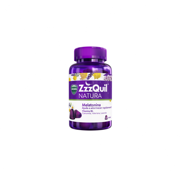 ZzzQuil Natura é um suplemento alimentar com Vitamina B6, Melatonina, Camomila, Valeriana e Lavanda, formulado para o ajudar a adormecer rapidamente. Composição por goma: 1,4mg de Vitamina B6; 1mg de Melatonina; 30mg Extrato de Valeriana; 10mg Extrato de Camomila; 10mg Extrato de Lavanda.